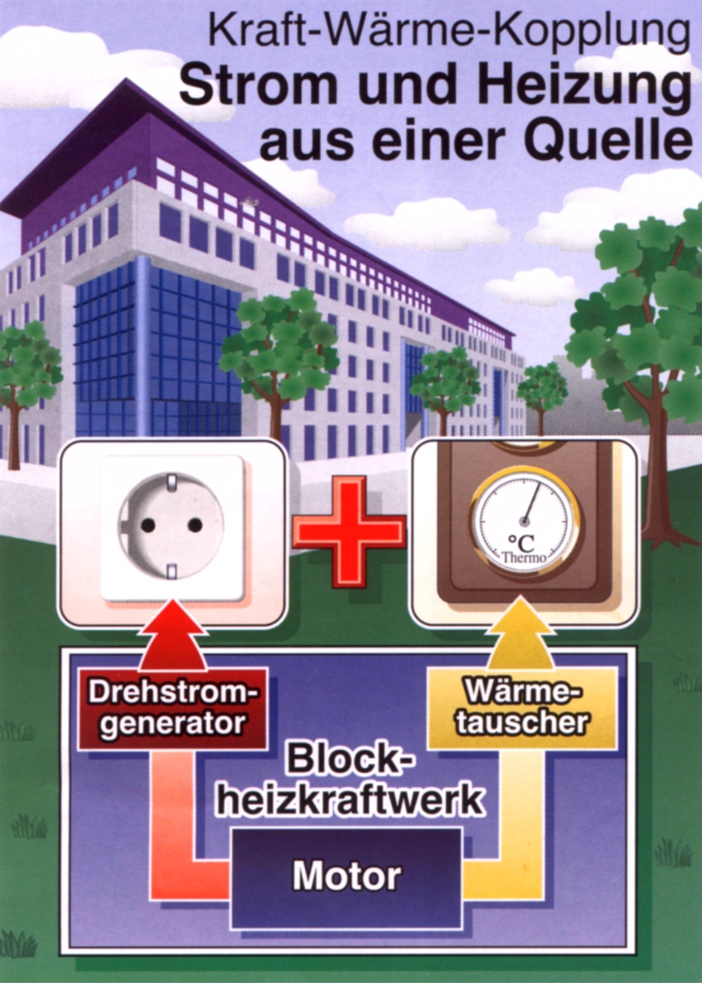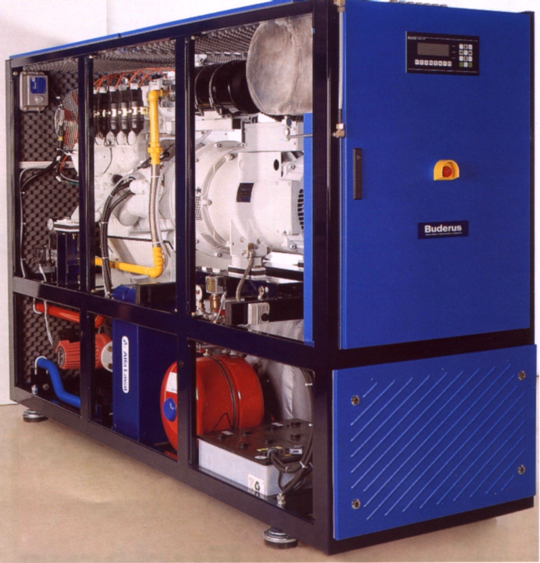Die elektrische Energie wird von einen Generator erzeugt, die thermische Energie aus der Abwärme des Generatorantriebs -
