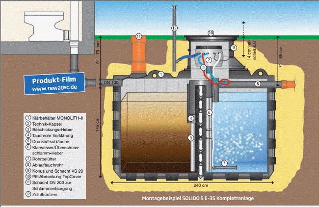 SBR-Klärsystem SOLIDOzur Nachrüstung vorhandener KläranlagenWenn Sie eine dichte 3-Kammer besitzen, bietet sich die Nachrüstung mit dem Rüstsatz SOLIDO KIT an. Dalle vorab genannten Vorteile gelten dafür genauso. REWATEC- Anlagen besitzen die DiBt- Systemzulassung und 3 Jahre Garantie auf die Klärtechnik. Funktionsweiseeiner vollbiologischen Kleinkläranlage